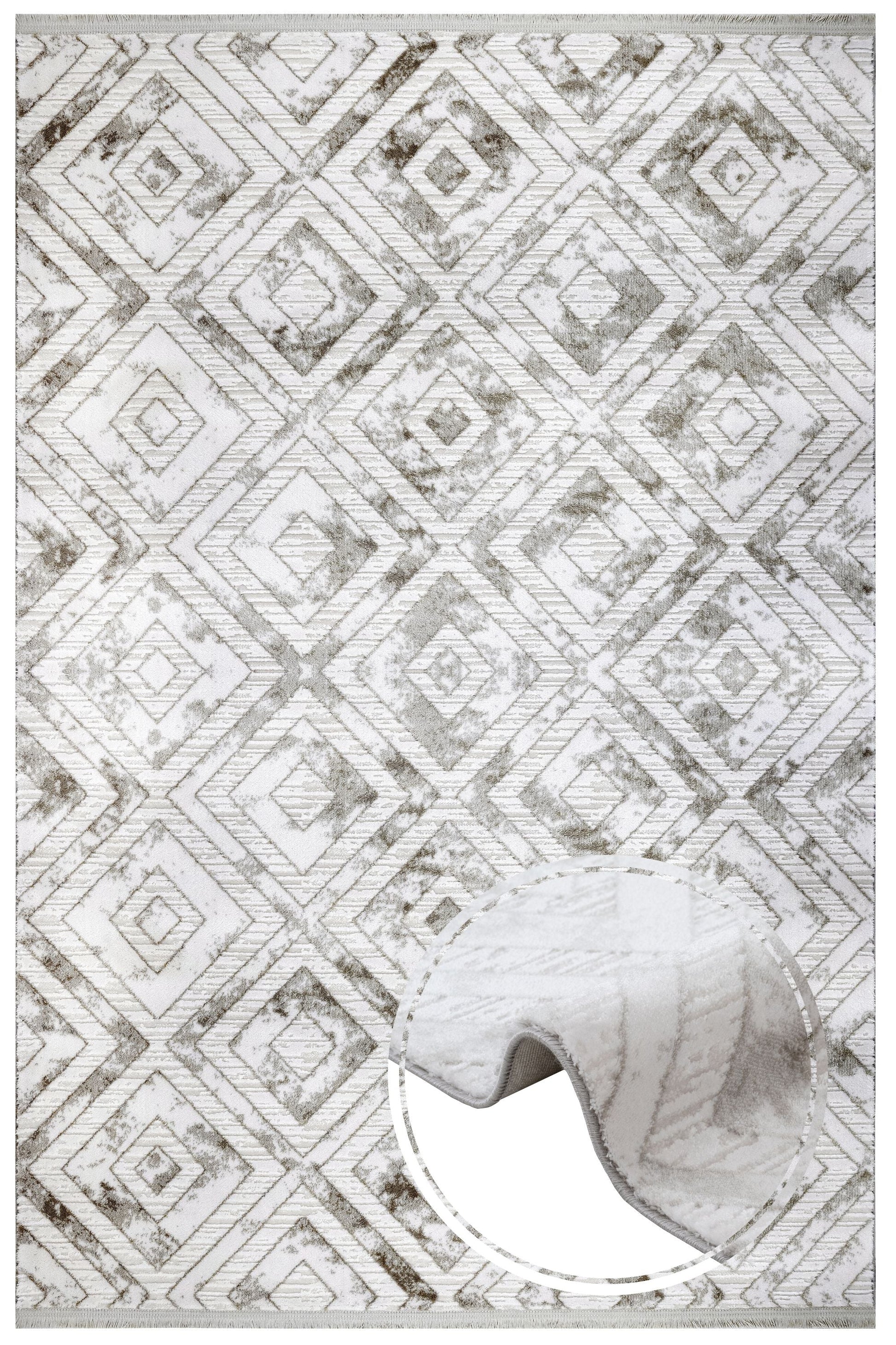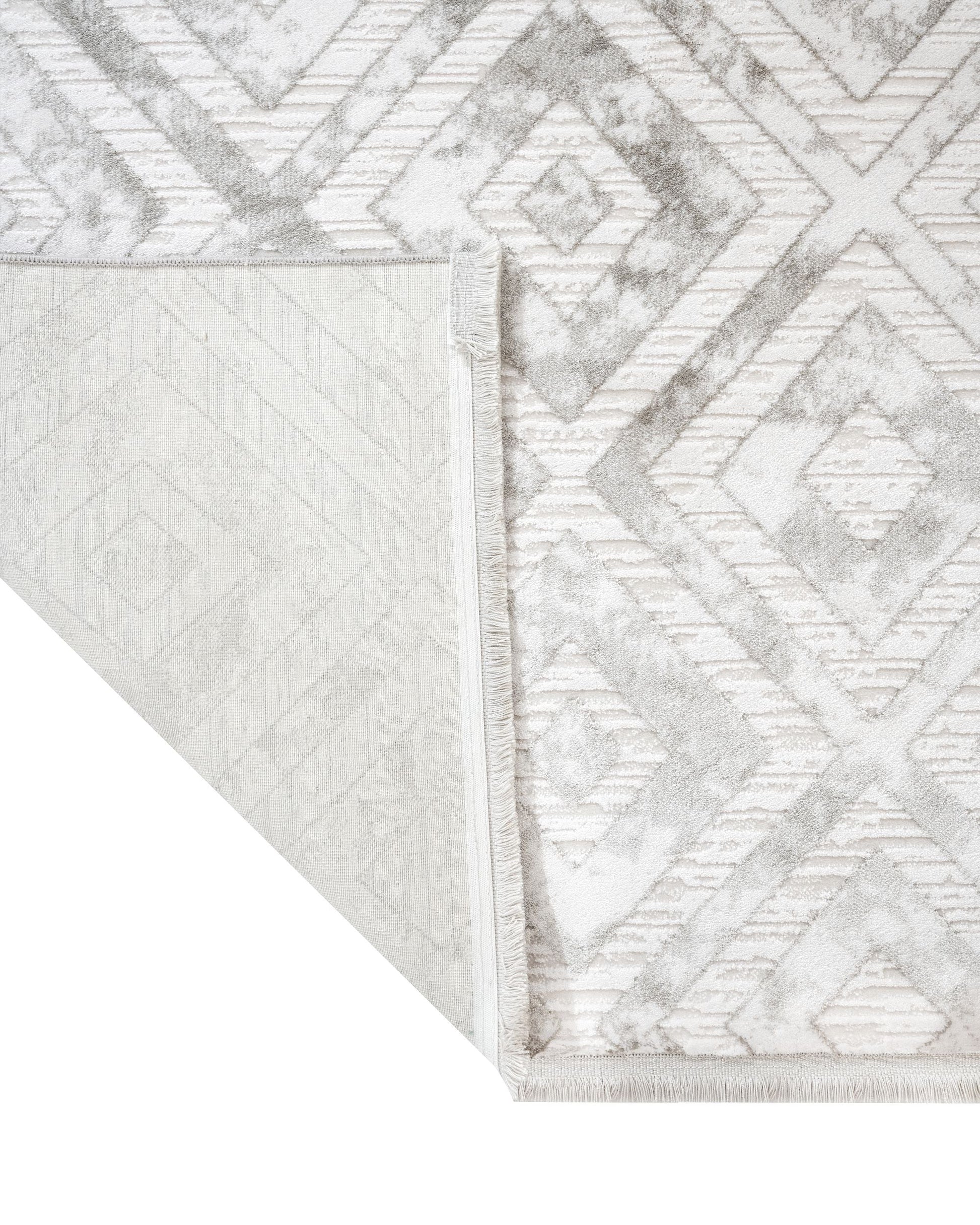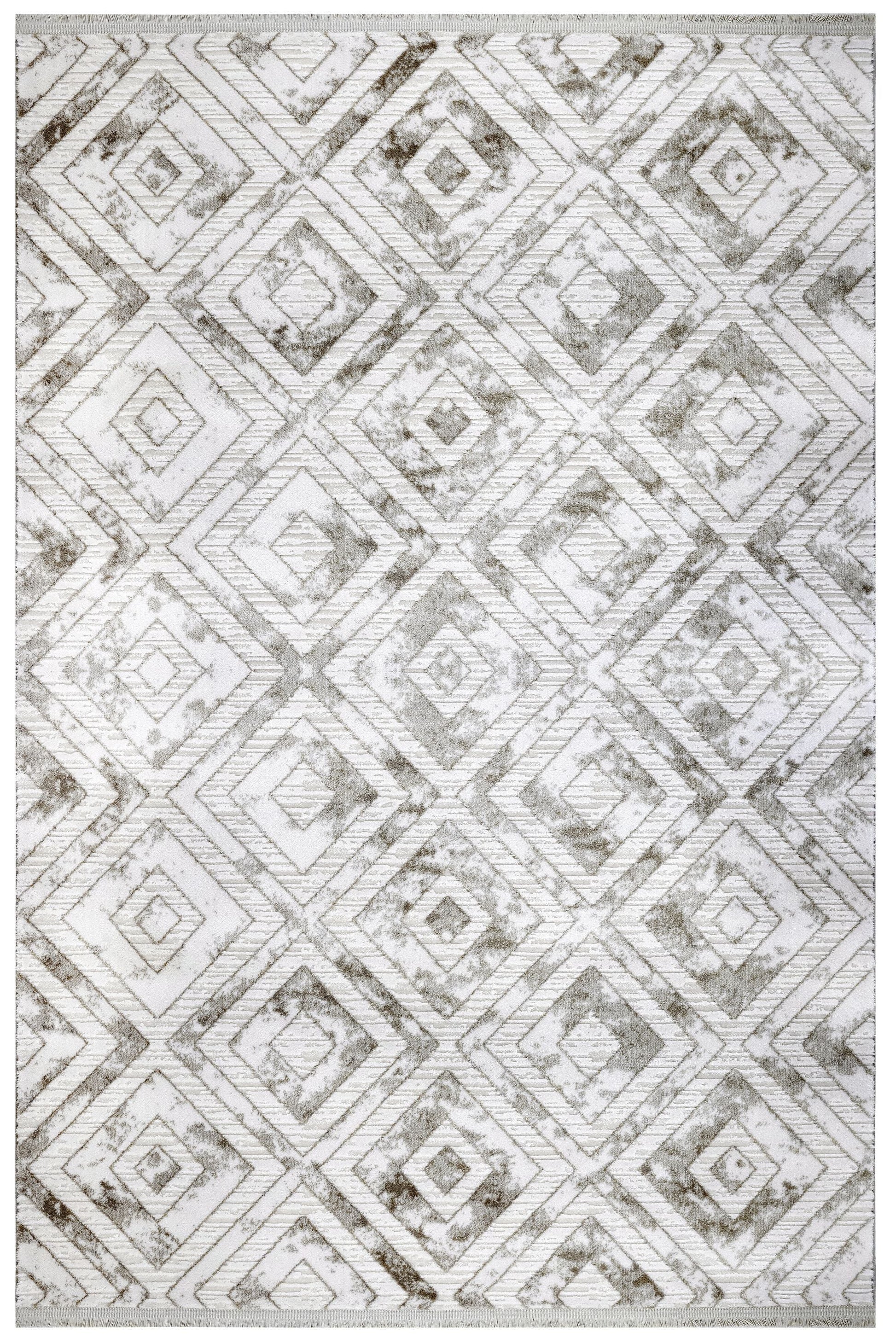 Geometric Area Rug - Machine Made Grey Acrylic Rug With Fringed Edges