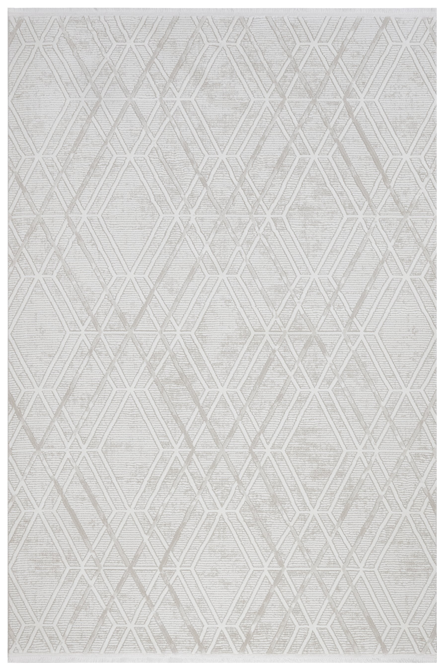 Cream Geometric Area Rug – Machine Made Micropolyester Carpet With Fringed Edges
