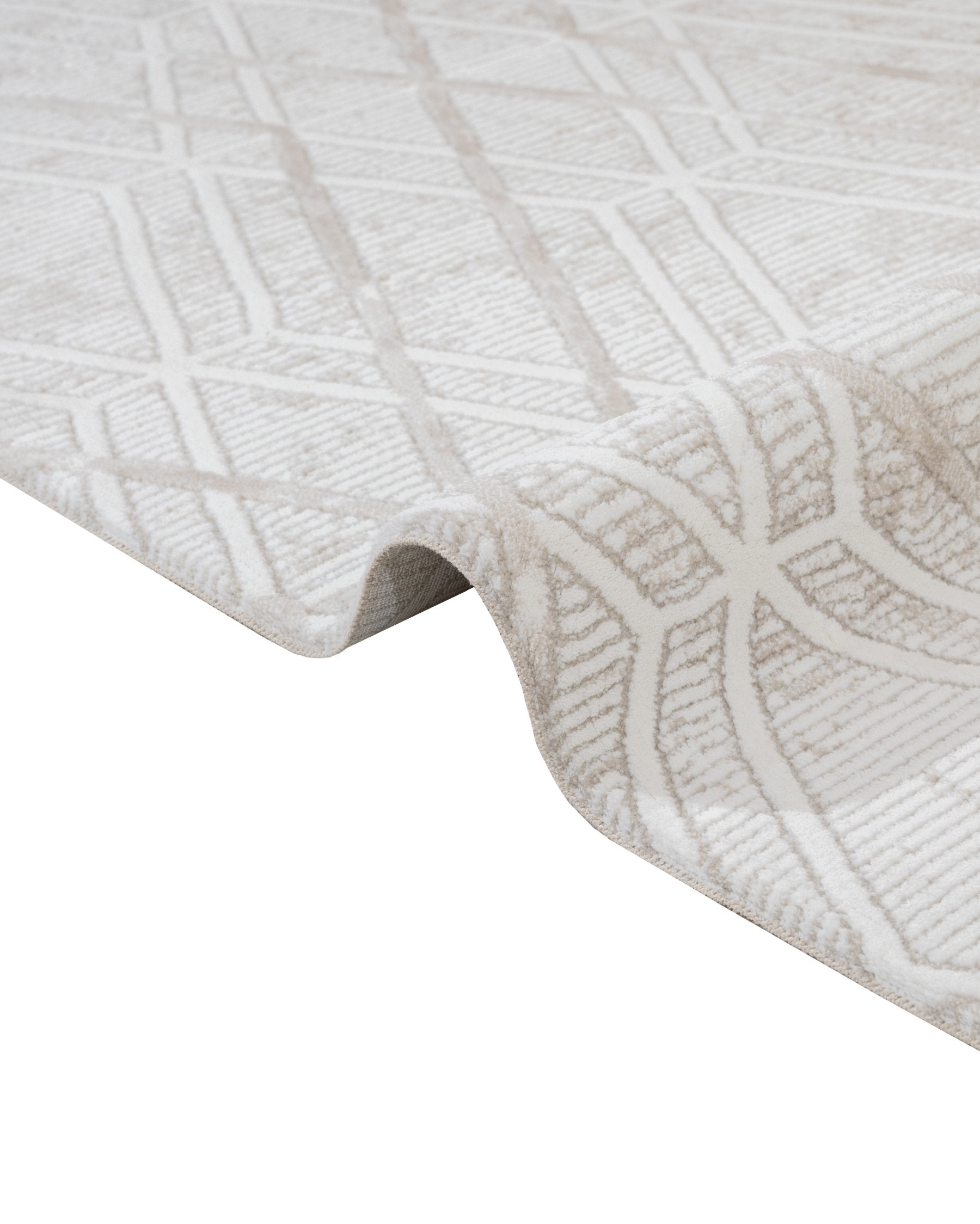 The cream geometric area rug is a machine made rug designed to enhance your modern living room with a stylish home decor rug that combines durability and softness. Crafted from high-quality micropolyester carpet fibers, this non slip area rug offers a soft texture carpet that feels comfortable underfoot while providing a durable floor covering for high-traffic areas. Its fringed edge rug design adds a contemporary floor mat appeal, making it an excellent choice for hallways or living spaces seeking a customizable design rug that fits seamlessly with various interior styles.