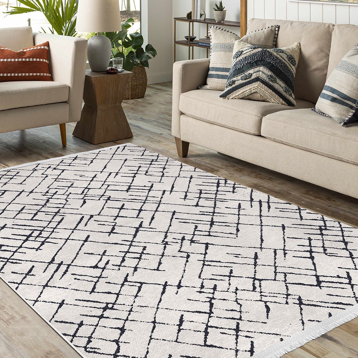 Easy to clean and maintain, this durable cotton carpet resists stains and shedding. Its natural latex backing not only anchors the rug firmly but also protects your floors from scratches. Ideal for homes with children or pets, the anti slip floor mat feature provides peace of mind. Elevate your space with this modern striped rug that combines practical benefits with timeless design.