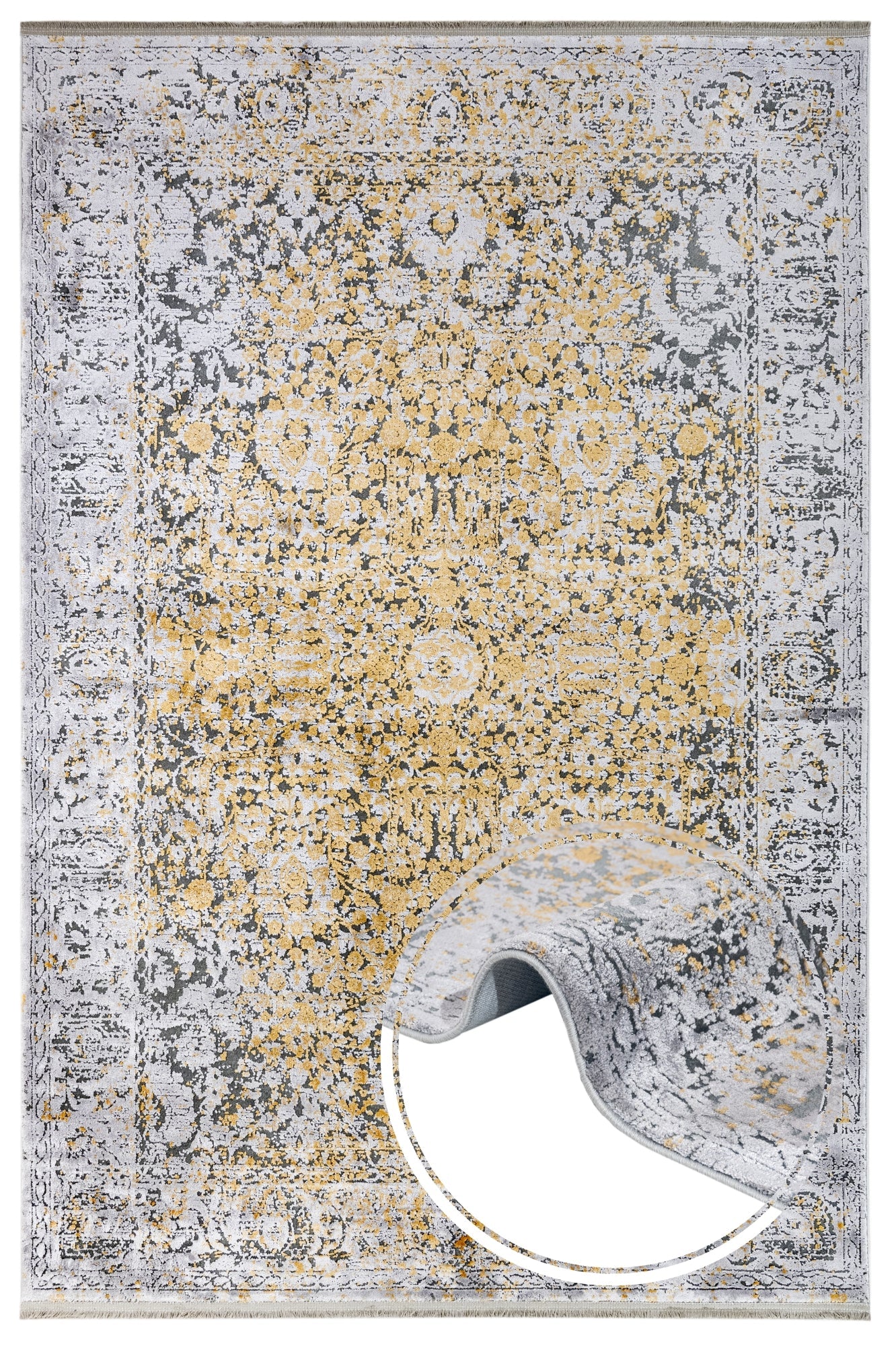 The Vintage Viscose Area Rug by Artemis is a machine made rug designed to elevate your living room rug experience with its luxurious gold tones and soft viscose carpet texture. This vintage style carpet blends classic charm with modern durability, offering a decorative floor rug that transforms any space into a stylish home environment. Crafted from high-quality viscose, this luxury viscose rug features fringed edge carpet details that add an elegant finishing touch to your décor. Tested for durability, it serves as a durable floor covering that withstands daily use while maintaining its rich color and softness.