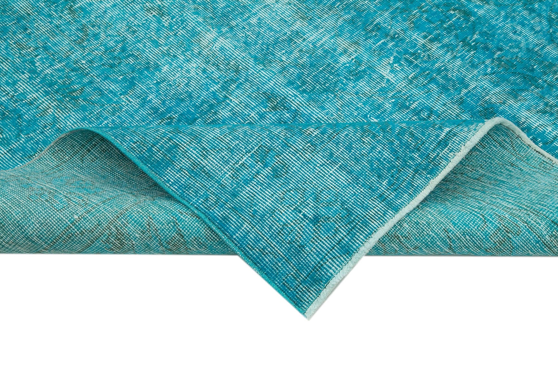 Each hand knotted carpet is carefully selected from 30 to 70-year-old vintage carpets, ensuring unique character and quality. The overdyed area rug undergoes special washing techniques that neutralize original colors and refresh the shades to vibrant turquoise hues, making it a stunning centerpiece for your home.