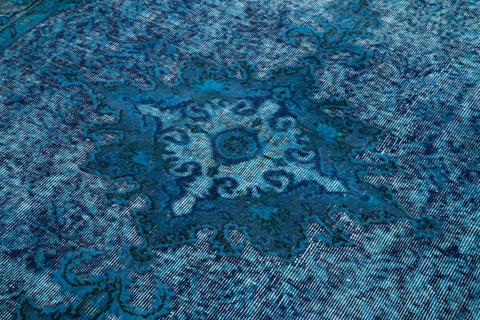 This antique area carpet is made from 30 year old carpet materials, carefully selected to preserve their quality. The turquoise wool carpet is treated with special washing techniques that neutralize original colors and slightly alter hues for a refreshed vintage look without losing authenticity. Using natural fiber rug materials means it’s breathable, hypoallergenic, and easy to maintain.