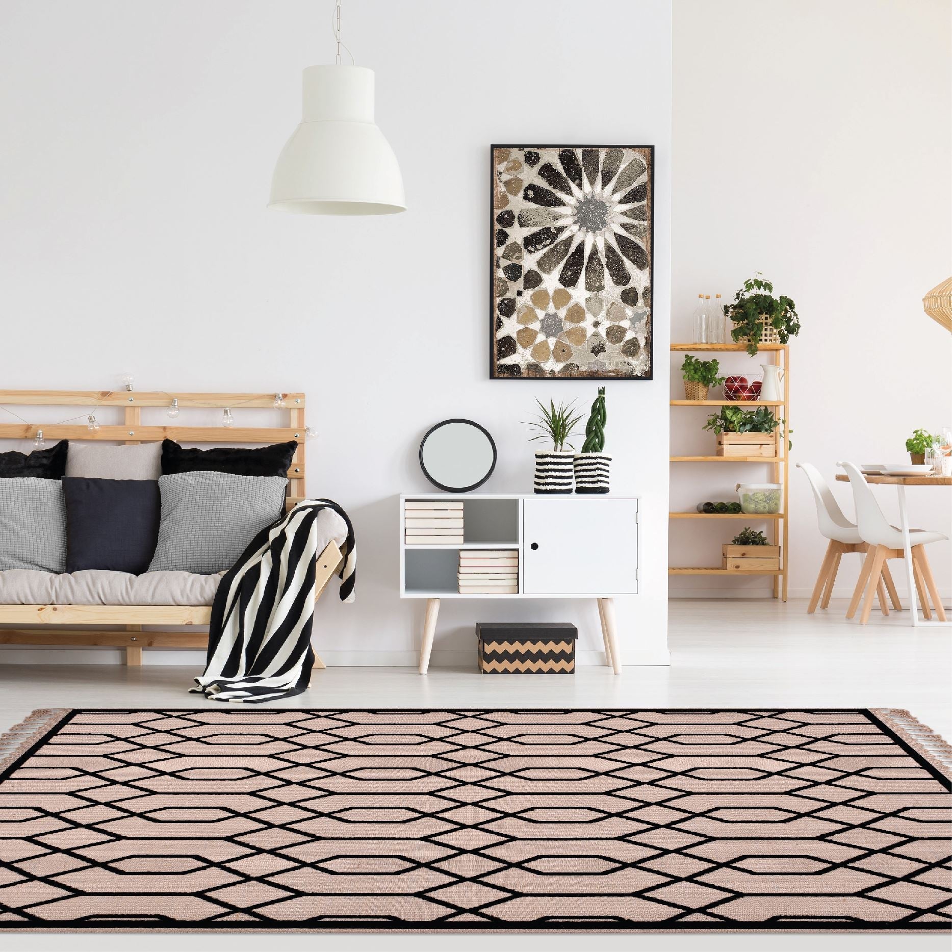 This fringed area rug combines modern geometric carpet patterns with practical design elements to fit seamlessly into contemporary interiors. The machine woven floor rug construction ensures consistent quality and longevity, while the non slip kitchen rug feature adds safety to your home environment. The brown black rug tones complement various décor styles, making it a versatile addition to any room.