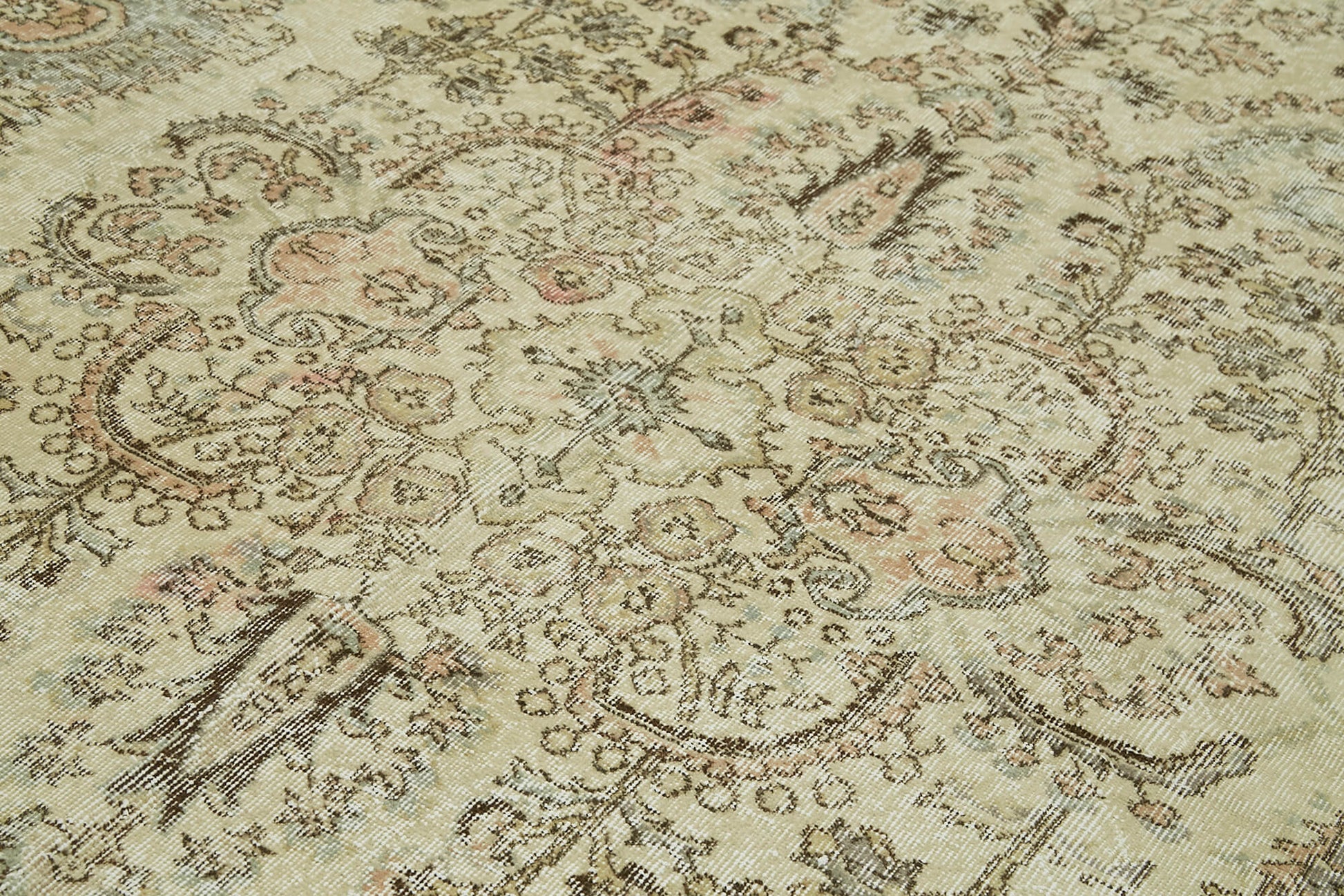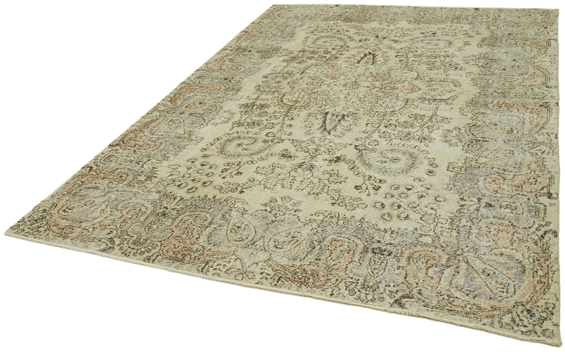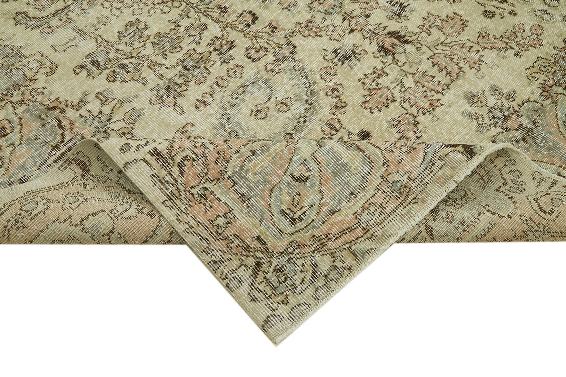 Each hand knotted carpet is carefully selected from vintage carpets aged between 30 and 70 years, ensuring authentic texture and character. The beige area rug features natural fibers that provide lasting durability and softness underfoot. Using special washing techniques, the original colors have been neutralized and subtly altered to create a unique, muted palette that complements bohemian style rugs and traditional wool rug collections alike.