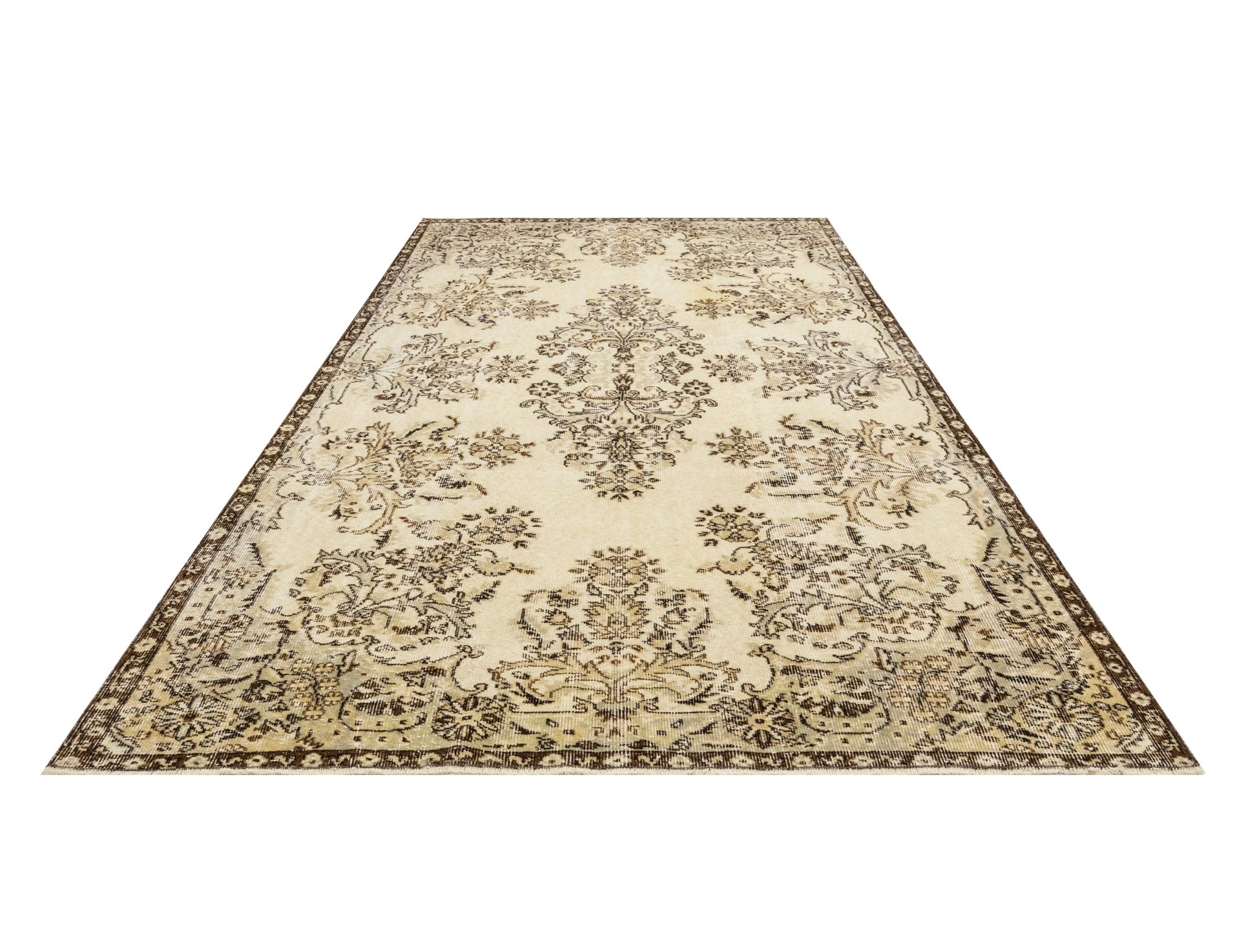 Each handmade area rug is carefully handwoven using techniques passed down through generations in Anatolia during the 60s and 70s. The vintage wool rug fibers are meticulously selected, cleaned, and washed to revive their rich colors and intricate patterns. This brown medallion carpet not only elevates your home decor but also serves as a long-lasting investment in quality craftsmanship.