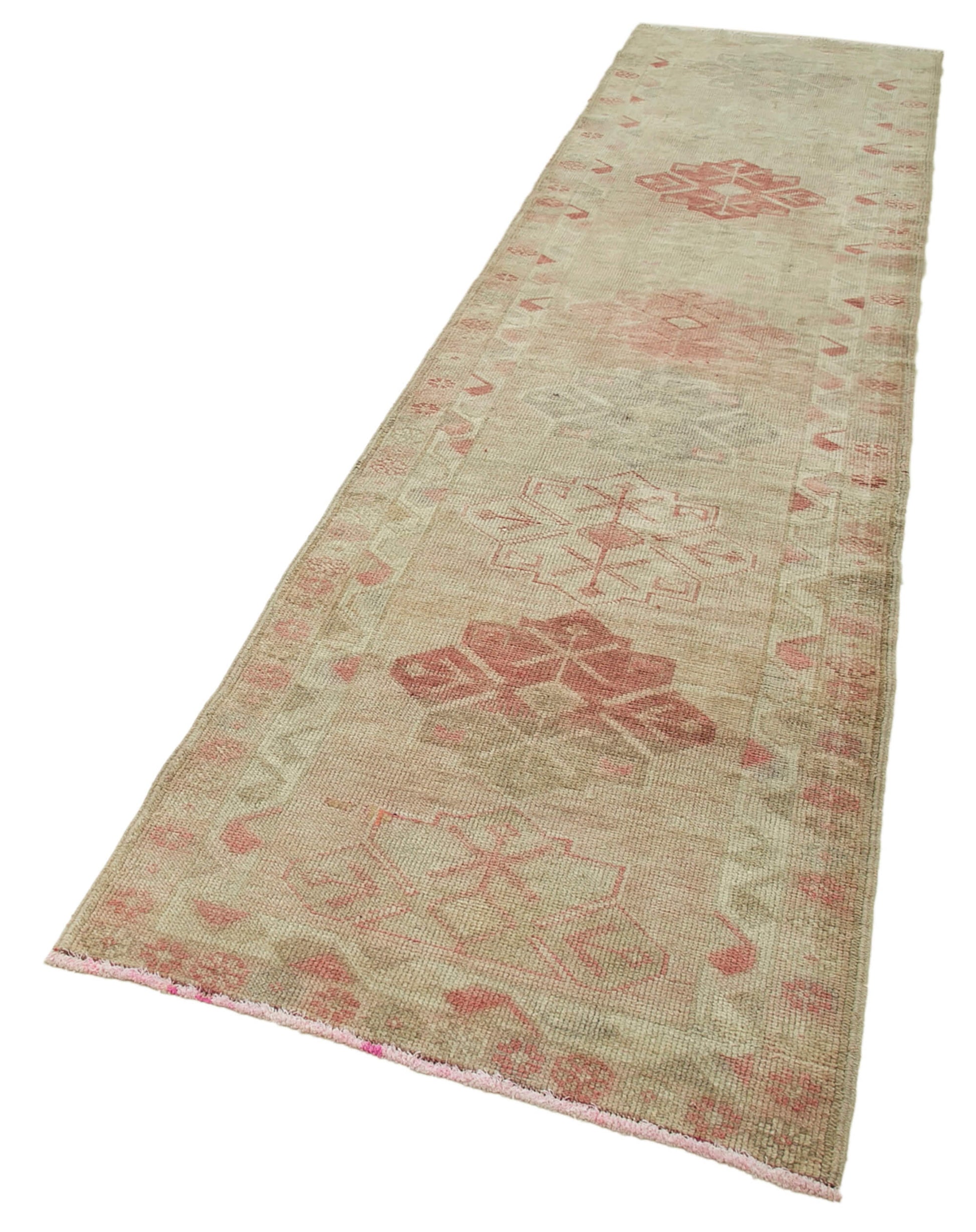 Handmade Vintage Area Rug – Beige Wool Cotton Carpet 2'11''x11'8'' Soft Floor Covering