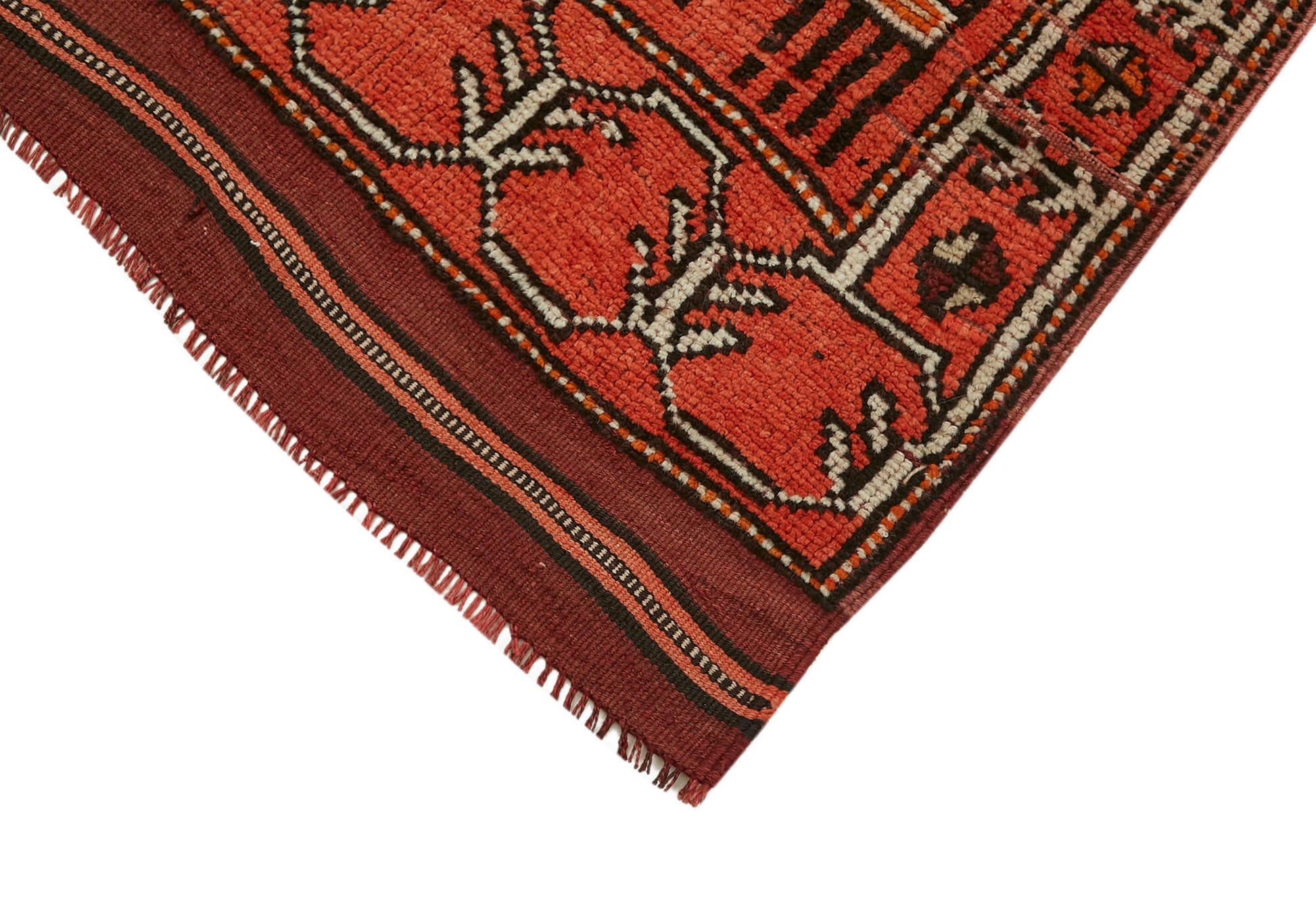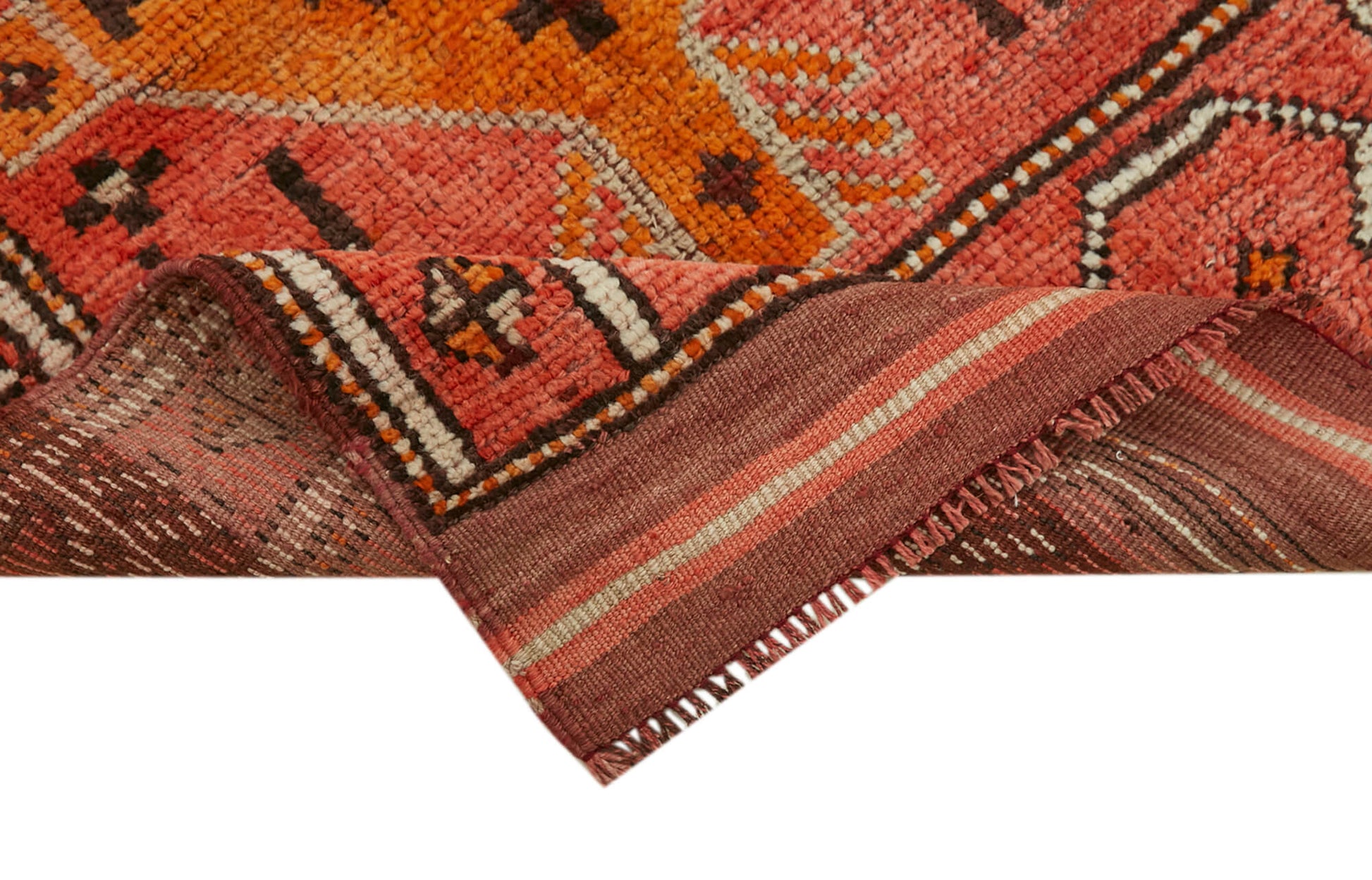 The orange Herki rug features a rich color palette achieved through special washing techniques that neutralize and subtly shift the original shades, preserving the handcrafted vintage carpet's authentic look. This durable handmade rug delivers both elegance and resilience, making it ideal for high-traffic areas while maintaining a soft feel underfoot.