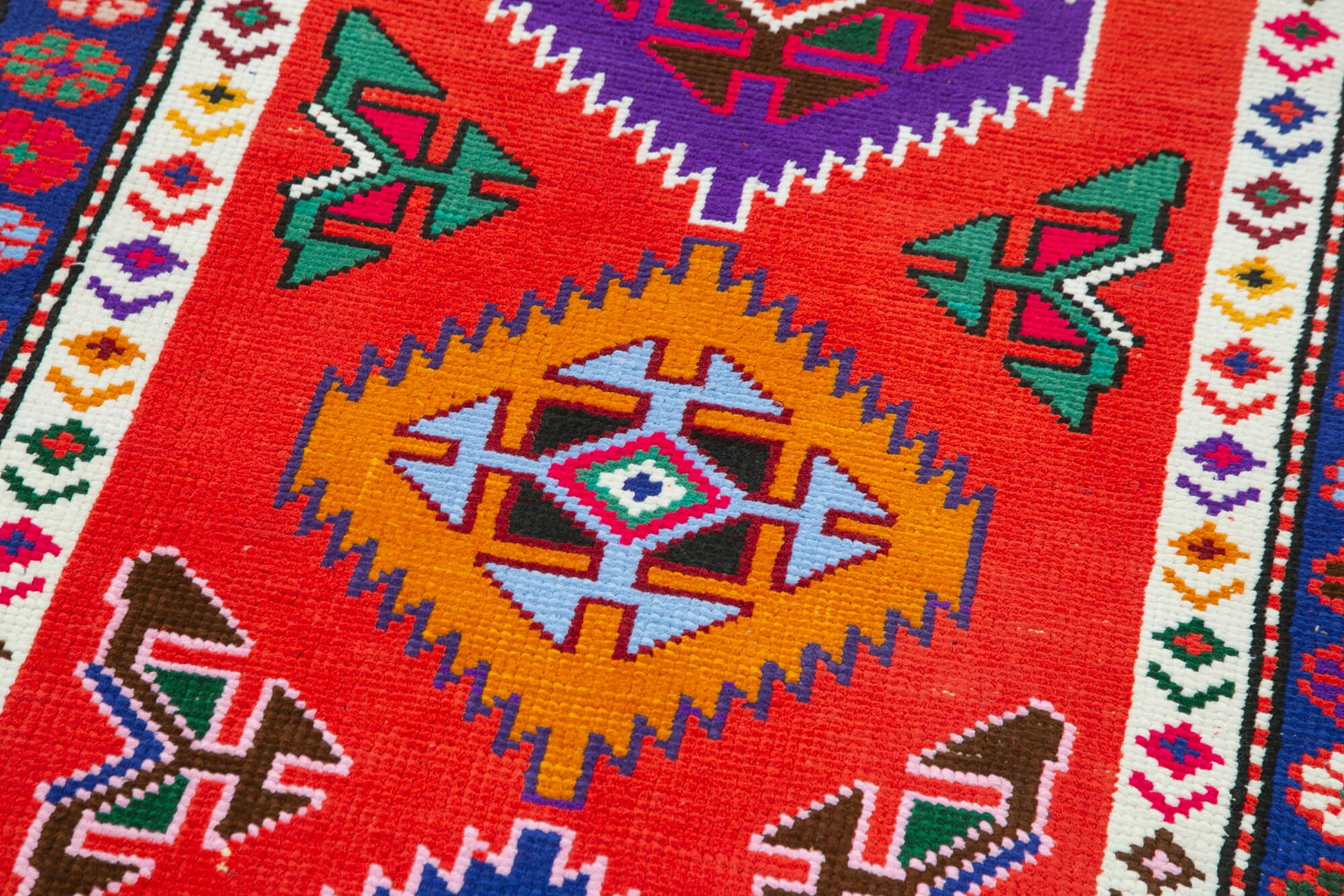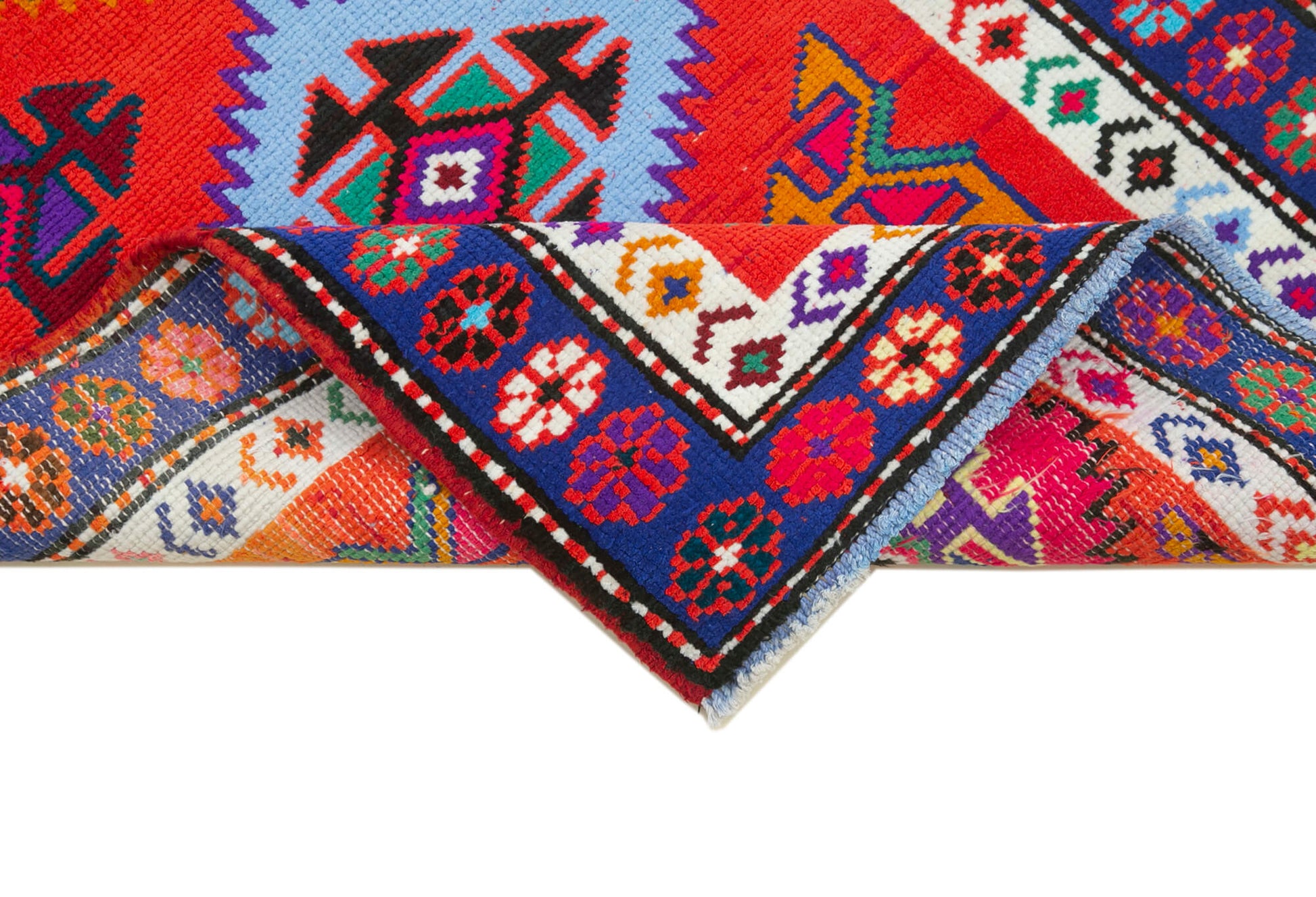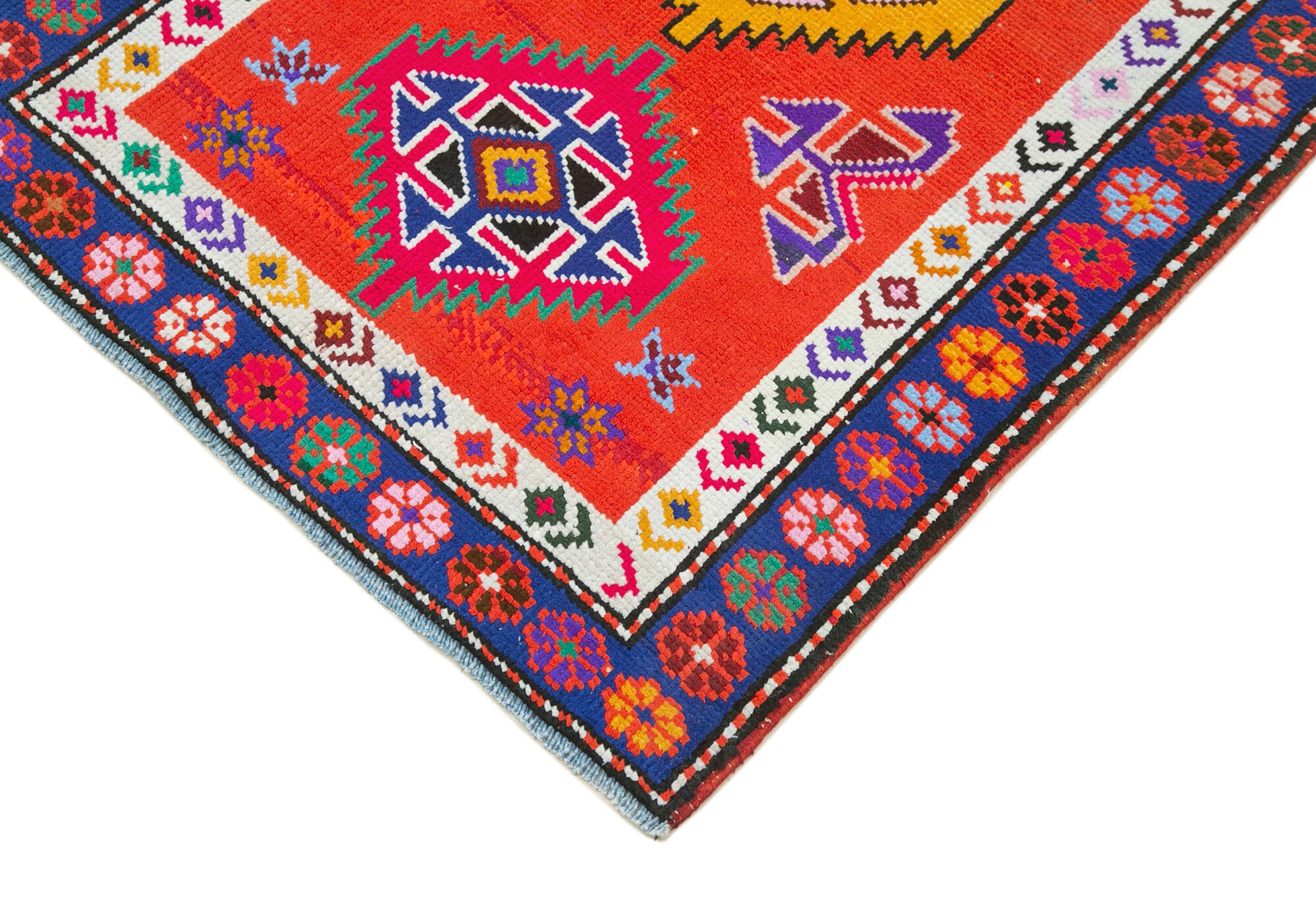This Turkish wool rug features hand dyed carpet techniques that enhance its rich red area carpet hues. The vintage carpets are between 30 to 70 years old, each one meticulously selected, cleaned, and washed using special methods to neutralize original colors and subtly shift shades for a refreshed look. This process maintains the integrity of the traditional hand knotted rug craftsmanship while delivering a vibrant yet authentic finish.