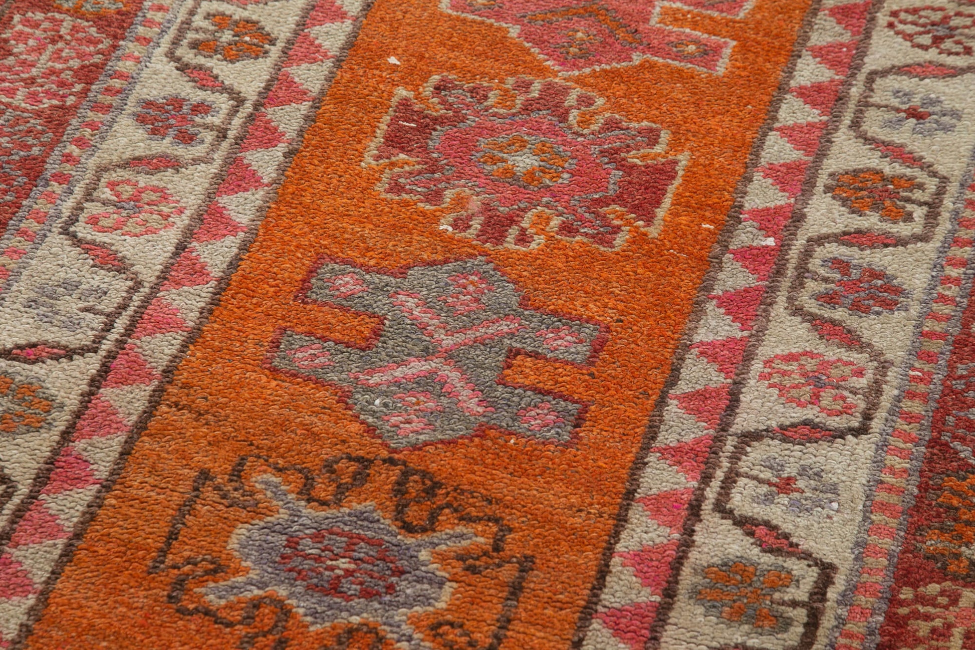 This handmade vintage area rug is a Vintage Herki Red Vintage Cotton Wool Handmade Area Rug measuring 2'11'' x 12'9''. Crafted with traditional hand knotted techniques, this Turkish wool rug combines natural wool fibers and soft cotton texture to deliver a durable area carpet that enhances any living room rug setting. The red Herki carpet design offers a unique bohemian style rug appeal, perfect as a retro floor covering or an authentic Turkish rug centerpiece.