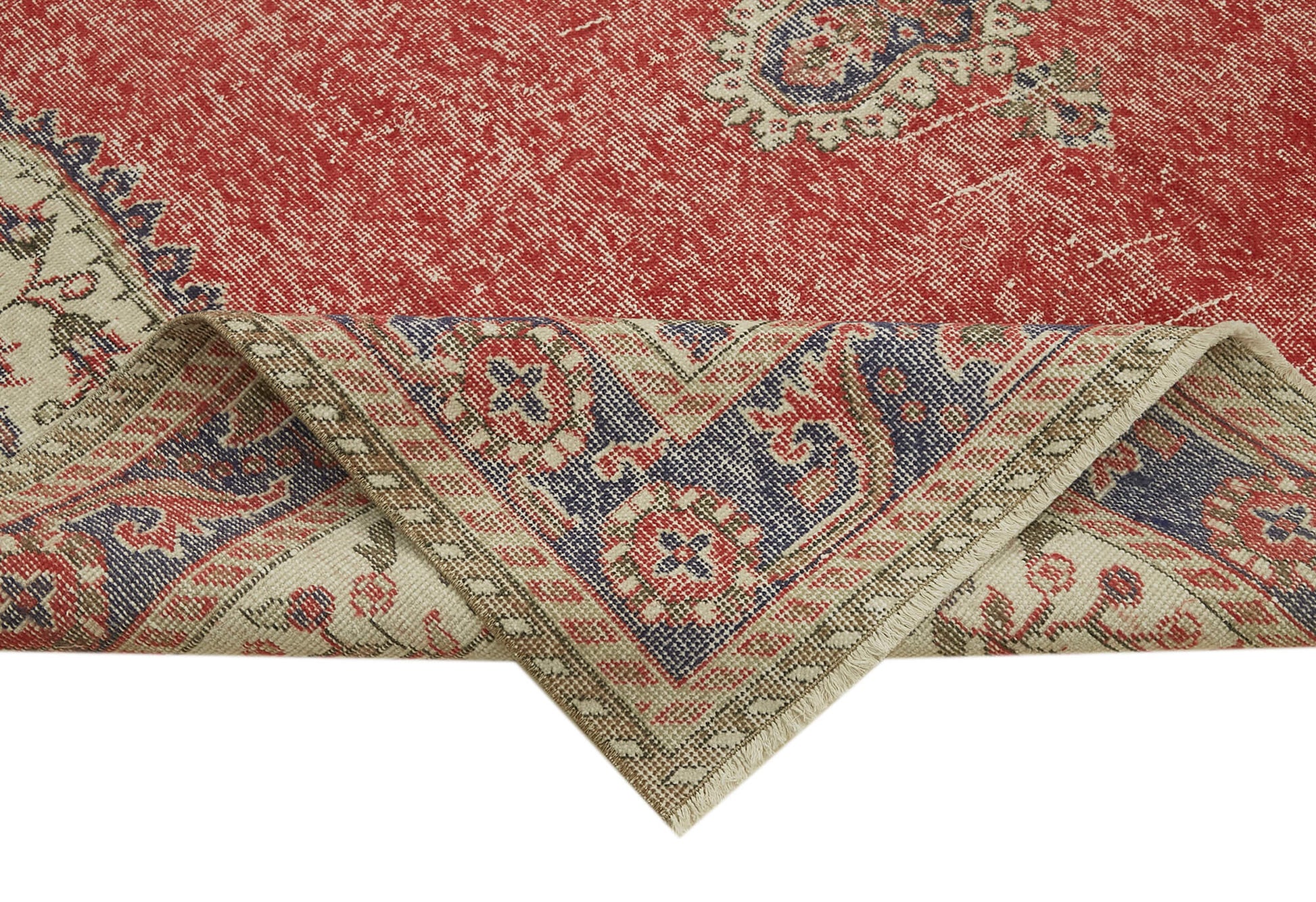 Made from a cotton blend carpet base with a durable wool rug pile, this red wool carpet measures precisely 6 feet 8 inches by 10 feet 9 inches, fitting perfectly in medium to large rooms. The natural fiber rug is carefully cleaned and washed using special techniques that neutralize original colors and subtly alter the shades, enhancing the classic area carpet’s rustic charm without compromising its antique appeal.