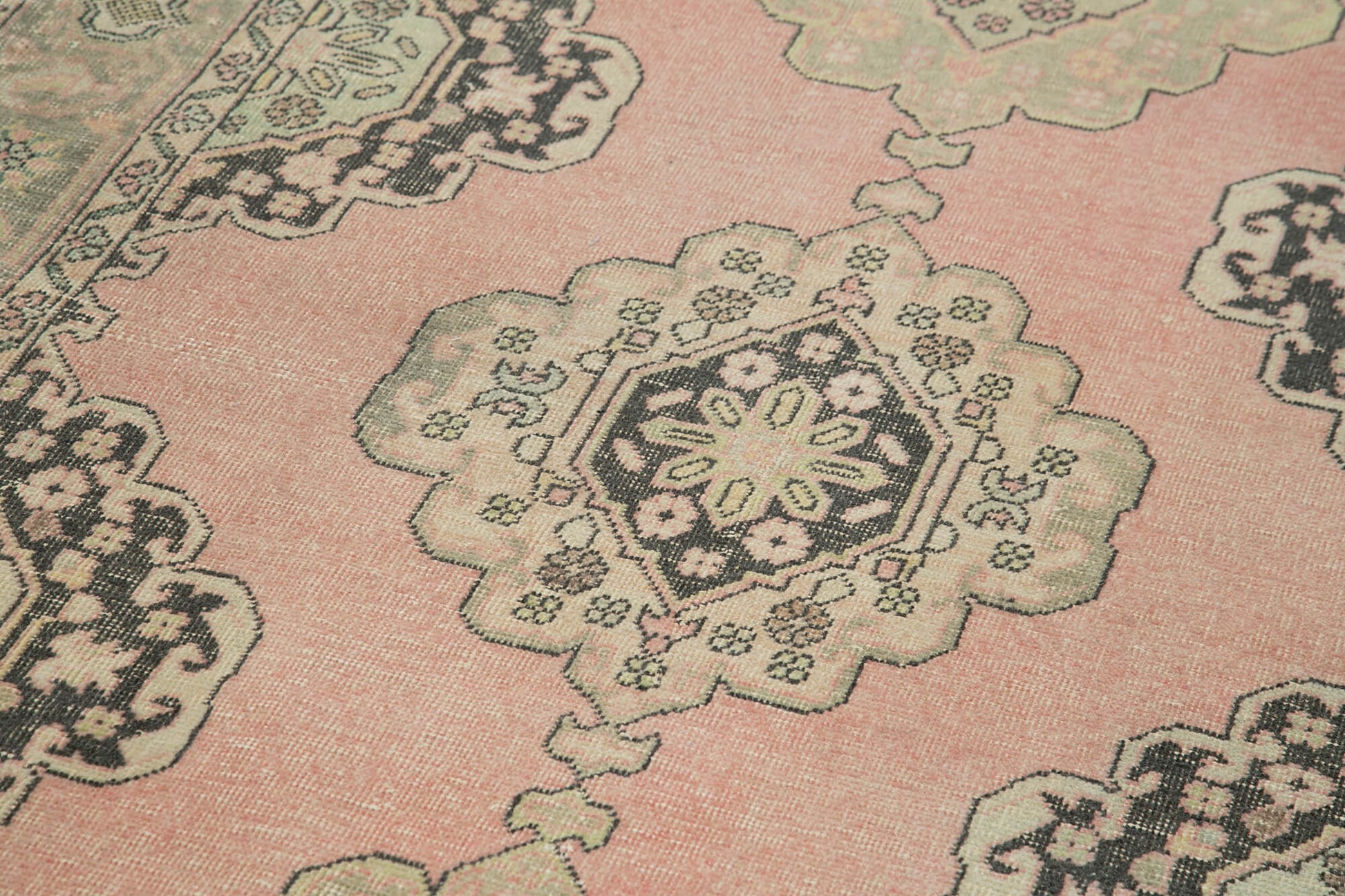 This beige wool carpet has undergone meticulous restoration processes to maintain its quality and appearance. The vintage cotton rug fibers are carefully selected from carpets aged between 30 and 70 years, ensuring authenticity and character in every piece. The traditional vintage rug construction guarantees resilience against wear, making it suitable for high-traffic areas such as living rooms or hallways.